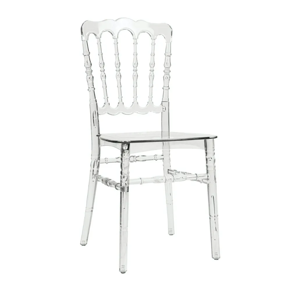 A transparent polycarbonate chair inspired by classic Napoleon design, combining elegance, durability, and high-capacity logistics for professional event use.