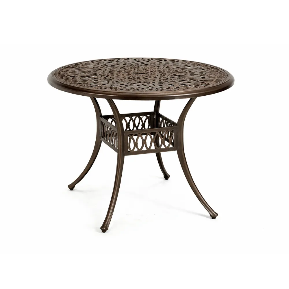 Orbit Cast Aluminum Table Ø90 combines an ornate tabletop pattern with a balanced four-leg structure. Its classic design brings sophistication to cafés, restaurants, hotel terraces, and garden dining areas.