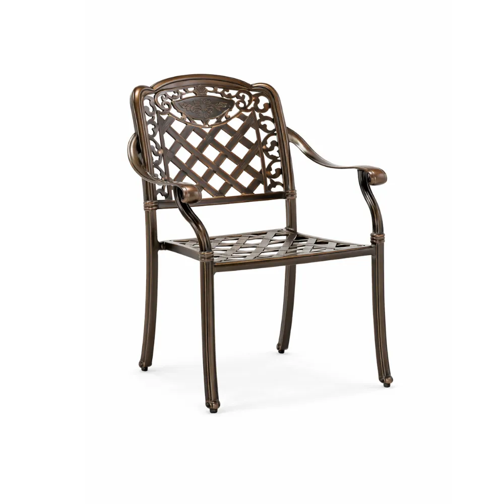 Ottavia Cast Aluminum Armchair features a refined lattice-pattern backrest and a durable cast aluminum structure, designed for elegant outdoor seating environments.