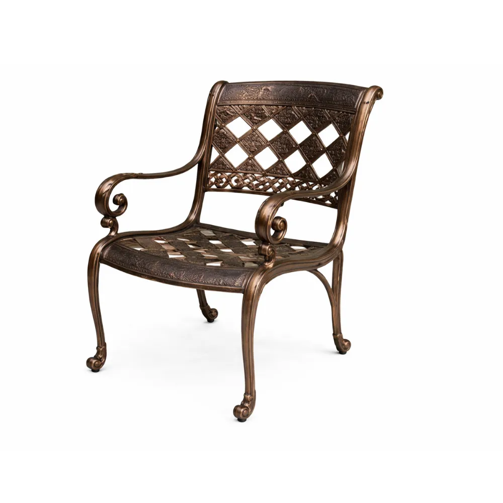 Palazzo Cast Aluminum Armchair features a bold ornamental backrest and a heavy-duty cast aluminum structure, designed for luxurious outdoor seating environments.