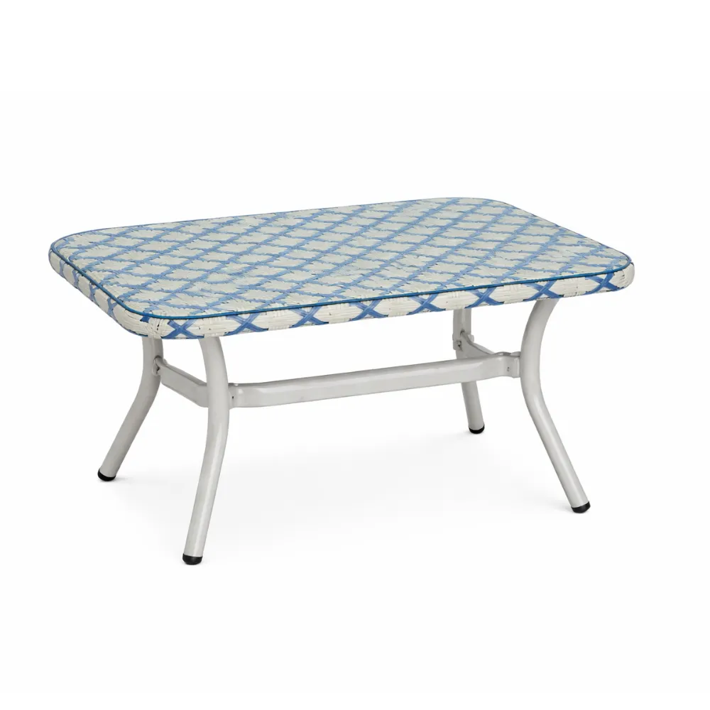 Riviera Tea Table features a compact PE rattan tabletop and a durable aluminum frame, designed as a practical low table for cafés, lounges, and outdoor seating areas.