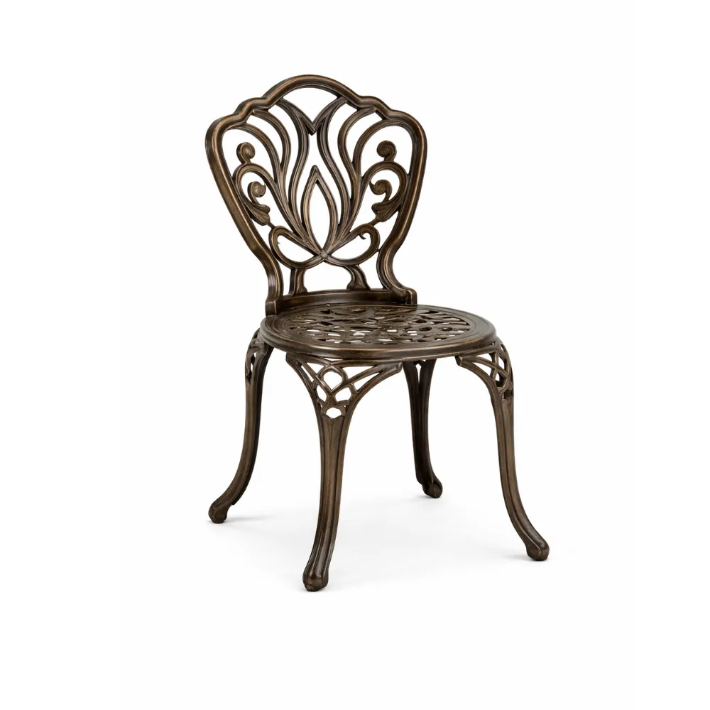 Rosa Cast Aluminum Chair features an elegant ornamental backrest and a lightweight cast aluminum structure, designed for classic outdoor seating settings.