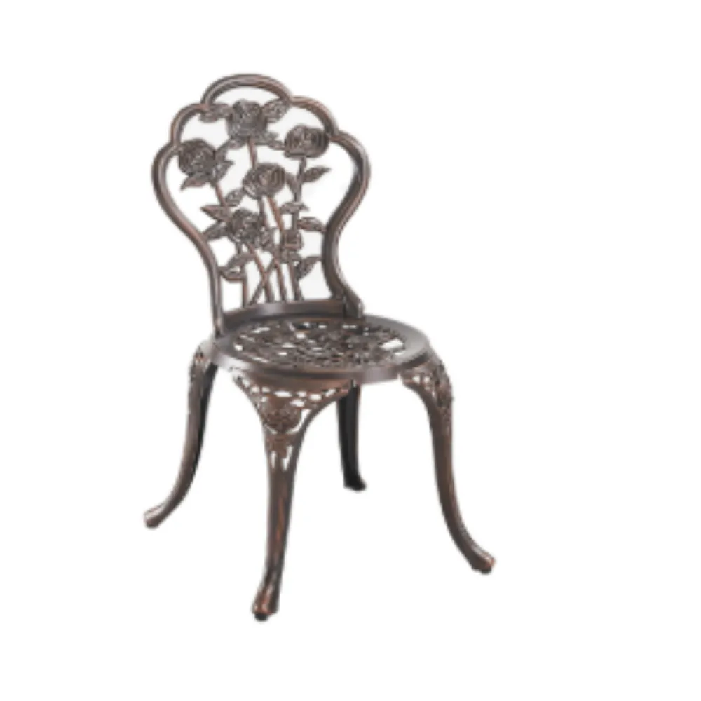 Rosella Cast Aluminum Chair is distinguished by its decorative floral-pattern backrest and softly curved legs. The elegant detailing adds a refined and graceful character to cafés, restaurants, hotel terraces, and garden seating areas.