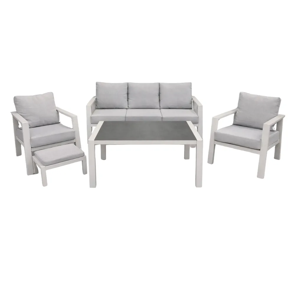 Valeria Mini Outdoor Seating Set features a compact aluminum frame, glass tabletop, and comfortable cushioned seating, designed for smaller outdoor spaces with modern style.