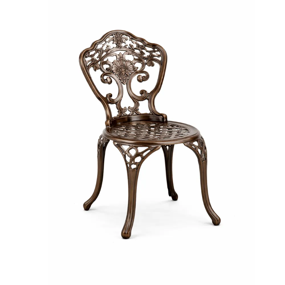 Victoria Cast Aluminum Chair stands out with its richly detailed decorative backrest inspired by classical European motifs. The elegant curves and refined silhouette bring a premium and timeless look to cafés, restaurants, hotel terraces, and garden seating areas.